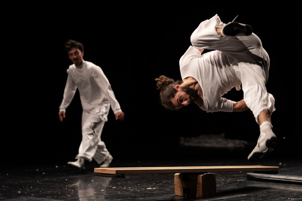 Auf der Bühne begegnen sich die beiden Zirkusartisten Demian Bucci und Guilhèm Charrier und entführen das Publikum in eine Welt voller Nonsense, Akrobatik, Tanz, Lautmalerei, Musik und Krach. Sie entfliehen der Schwerkraft, schweben durch die Lüfte, verwandeln sich in skurrile Kreaturen und lassen den Alltag mit seiner zwanghaften Logik von Wachstum und Selbstoptimierung weit hinter sich.
